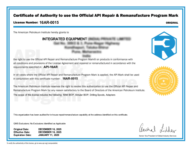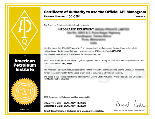 • API 6A • API 16A • API 16AR • API 16C • API 20E • ASME U • CE & CRN • API Q1 • ISO 9001-2015